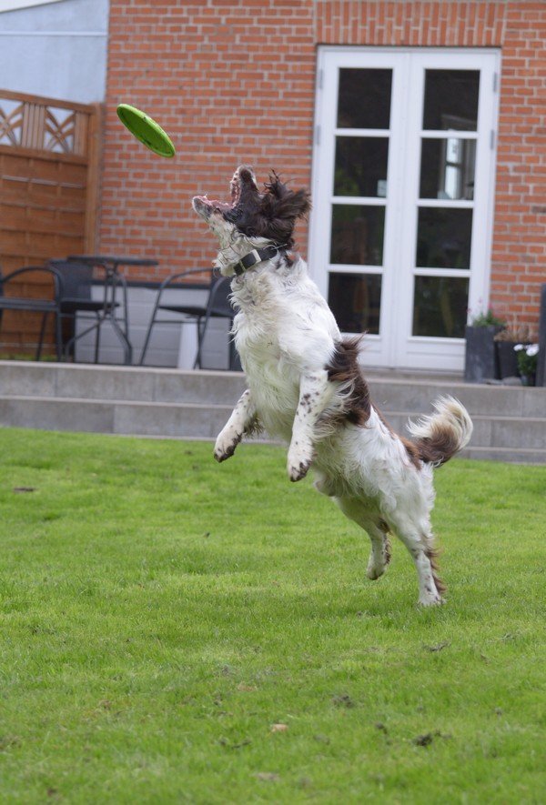 Når man har en hjælper til at kaste frisbeen kan man nogenlund forberede fotograferingen, men helt forudsigeligt er det nu ikke, hvor frisbeen vil flyve hen. Og hvor frisbeen er, kan man også finde Nemo, som gladeligt tonser af sted og springer efter den flyvende grønne tallerken.