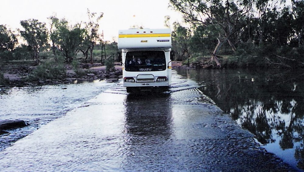 Mandag d. 23. oktober 2000 Tidlig afsted for idag skulle vi passere grænsen til Western Australia og ude i ingenting var der en slags toldsted og checkede lidt. De checkede for frugt og grønt for det måtte vi ikke ta' med over grænsen. Så vi spiste bananer i stor stil og grøntsagerne dumpede vi. Underlig. Vi fandt ihvertfald ud af, at herude tankede man hver gang man ser en tank, hvor vi også provianterede lidt cola og hilste på de lokale. Tanken var samlingssted for de lokale aboriginere, der kom her for at lave ingenting. Svært at forestille sig et liv herude med langt til alt. Vi kørte nu ad Northern Highway mod Fitzroy Crossing og kørte i den sydlige del af Kimberley. Vi tog ud til Geikie Gorge Nationalpark og gik en lang tur ved den udtørrede flodleje. Hvis man skulle helt op i Kimberleys måtte man ha' en 4WD - det havde vi ikke. De gennemgående veje var asfaltveje - ellers jordveje. Nu så vi frem til at nå til Broome og Det Indiske Ocean. De gigantisk roadtrains blev flere og flere. Broome var en rigtig turistby og vi installerede os på Cable Beach Caravanning - et sted med familier, folk på motorcykler eller i en gammel bil. Et fantastisk sted tæt ved stranden, hvor vi grillede og hyggede os på pladsen.