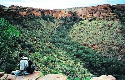Tirsdag d. 14. november 2000 Der var mødetid kl. 6.15 i receptionen og det er altid spændende at møde sine rejsemakkere. Vi var 15 deltagere og vor guide Warren. 1 fra USA, 3 fra AUS, 7 fra GB, 1 fra Scotland, 2 fra Århus og mig selv. Dagens mål var Kings Canyon - ca. 450 km sydover. Det var en lang tur i vor knap så luxoriøse bus så vi havde flere breaks til spisepauser og kamelridningspauser hvis det var noget. Vi blev endda sat på arbejde med at samle brænde til aftenens madlavning. Det tydede på en rigtig god tur med gode rejsefæller. Dagen blev brugt på vandreture i Kings Canyon med store og lange kløfter, der hæver sig 200 meter over havet. Var på en 6 km lang vandretur og selvom det var midt i ørkenen var der frodige pletter. Vi fik masser at vide om området af Warren. Perfekte fotospots i det kuperede terræn. Imponerende landskab og man sku' ikke lide af højdeskræk - der var langt ned. Vi var nede ved "Garden of Eden" - en frodig plet, hvor vi kunne bade lidt. Godt trætte fandt vi tilbage til bussen og kørte til vor camp, hvor teltene var klare. Det var forudopstillede telte i Adventure Tours camps. Det blev lavet mad over åben ild og alle mand var igang med opgaver - rigtig hyggelig. Desværre begyndte det at regne, tordne og lyne så vi trak ind i skuret og spiste. Den nat regnede det igennem og teltene var næsten tætte så det var en special oplevelse at ligge herude i ørkenen i regnvejr. Vi sov godt til kl. 6.00, hvor vi blev vækket.