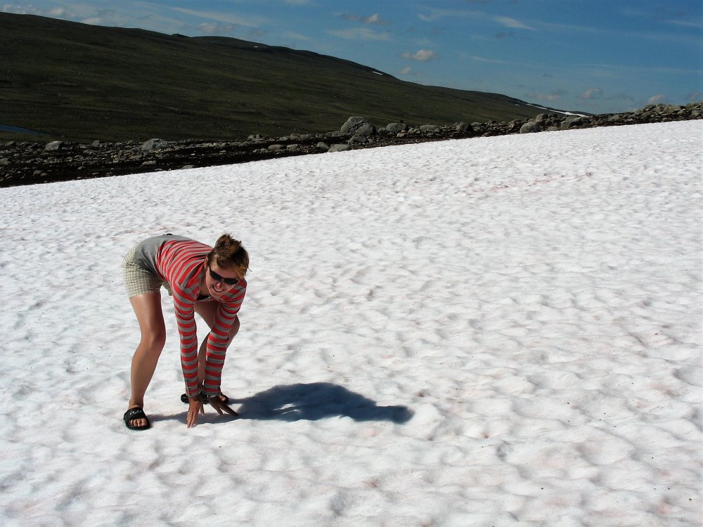 Lørdag d. 26. juli 2008Vi tog afsked med vor dejlige lille 1-stjernede campingplads - idag ville vi komme op over fjeldene så det glædede vi os meget til. Vi kørte stadig langs søerne og sneen begyndte at dukke frem i fjeldene i det fjerne. Træerne blev afløst af et mere barskt landskab - det var køligt, men stadig flot vejr. Vi kørte ovenpå fjeldet og efterhånden kom der flere og flere hytter - man fik helt lyst til et par dage på fjeldet. Der var mange flotte fjeldhoteller heroppe og vi var ude og snuse til den friske luft. Pludselig var der masser af sne så der skulle lige mules lidt. Masser af små søer og klipper - et fascinerende landskab. Vi rullede ind mod skisportsbyen Geilo og landede lige til lørdagsmarked på torvet. De lokale solgte spændende specialiteter. Vi tog op og så lidt på skiområdet og tog liften op på toppen. Det var TR's første tur med en skilift og jeg tror godt hun kunne lokkes til en skiferie. Selvom sådanne skiområder ser lidt sølle ud om sommeren havde vi en fin udsigt over dalen. Det var et super skiområde, men vi måtte videre sydover. Landskabet fladede ud og der blev mere og mere skov, men elvene og søerne var der stadig. Ved Kongsvinger ledte vi efter noget camping - det lykkedes ikke, men ved Hokksund fandt vi et super sted lige ned til Drammens Elven. Det var en rigtig lystfiskerplads, hvor mange lystfiskere havde base for deres laksefiskeri. I receptionen ku' vi se, at der var blevet fanget meget store laks i elven - sidste uge var der taget en på 10,2 kg. Om aftenen indskrev fiskerne sig til deres favoritparadis i elven og senere sejlede de ud i små joller. En lækker plads vi havde fundet. Om aftenen spiste vi i restauranten og nød det dejlige vejr.