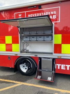 Sanitetskøretøjet er inddelt så der i bagenden er en område med rustfri håndvask og rullebure til udstyr. I midten er der et bruserum og forrest er der et rent rum med rent tøj. Udvendigt i højreside er der adgang til pantry med Quooker og køkkenting. Udvendigt i venstre side er der ligeledes adgang til opbygningens toilet.