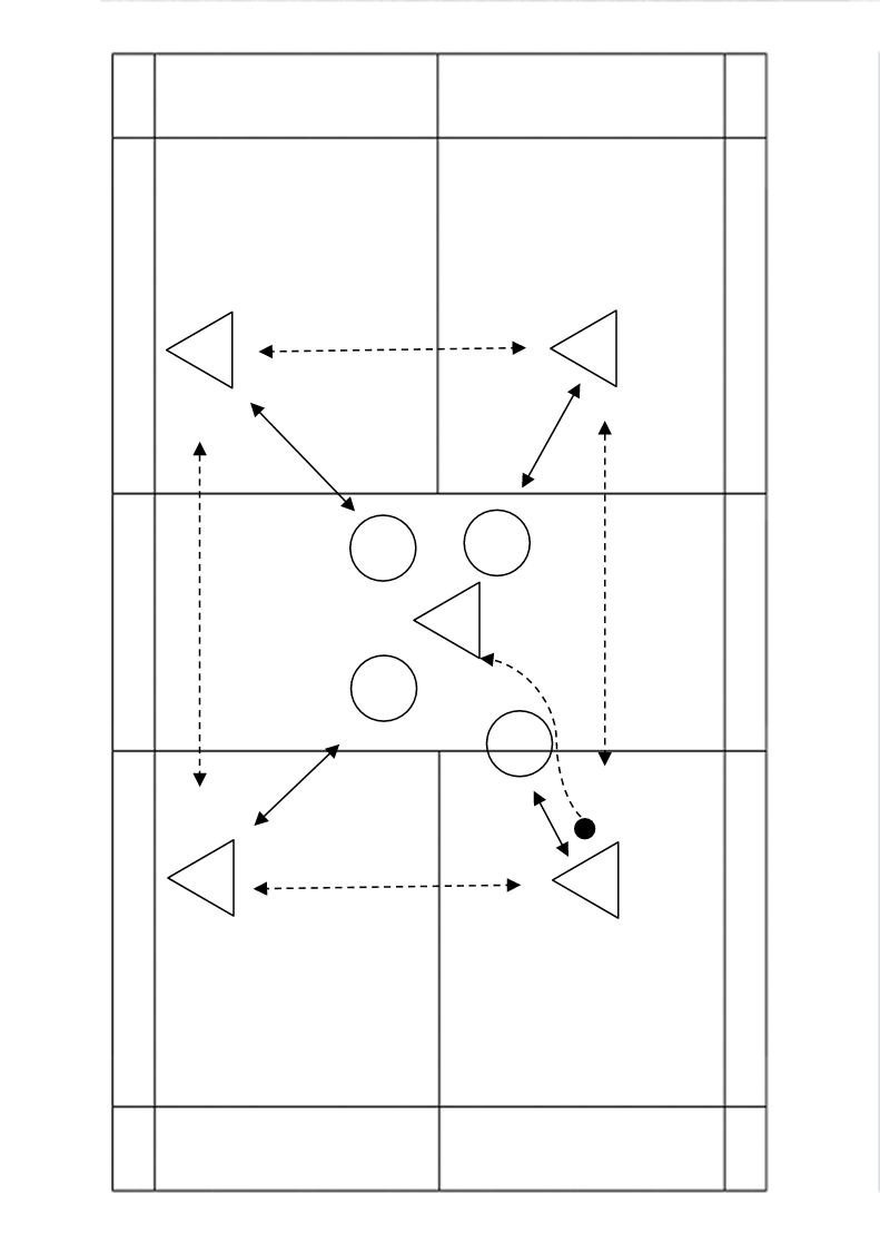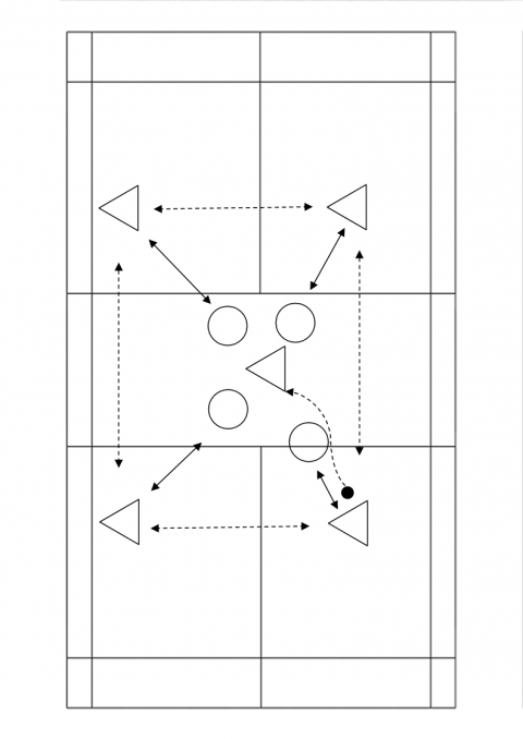 De 4 spillere i kvadratets hjørner skal forsøge at spille bolden til 'målet' i midten. De må kun aflevere langs kvadratets 'kanter; dvs. ikke i en blød bue ind over.