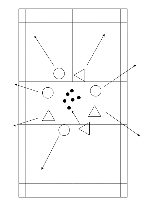 Udgangsopstilling - spillerne skal stå i en cirkel med ryggen til centrum Boldene placeret i midten af cirklen