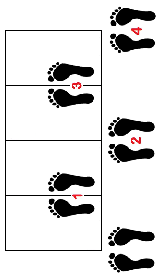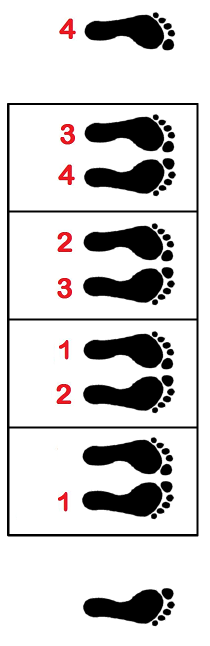 - Træd ind i anden firkant med venstre fod, hurtigt fulgt af højre fod. (1-2)