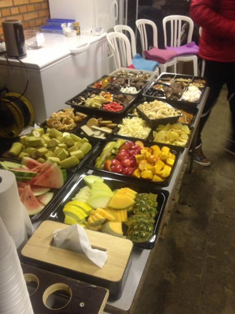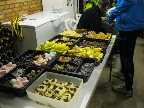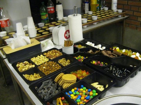 Spiseligt: Frugt (Banan, pære, melon, appelsin, jordbær, agurk - kan variere), slik (flere afskygninger - lakrids, saltlakrids, vingummi, saltvingummi, skumfidusser mv.), chips, saltstænger, nødder, chokolade, kiks & kanelgifler. Som regel vil der være kage og/eller andet til bagefter.