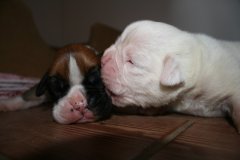 En boxer fik hvalpe (d. 5./5.) men der stødte komplikationer til og efter flere dage med stærke smerter og en opperation var der kun 2 overlevende hvalpe tilbage ud af 9. den stakkels biologiske hundemor mangtede ikke opgaven men Ida var klar. jeg lavede en aftale med Ida om at jeg gir' flaske og hun skal sørge for det med hygiejne, soinering, hundevarme og hundekærlighed - MEN, MEN, MEN... Ida holder ikke rigtig vores aftale - hun gir' også mælk nu (altså kun ved siden af mine flasker) Vi fik dem i pleje lørdag d. 10. om aftenen og de tager begge to fint på og trives godt. Vi er bare sååå stolte af vores lille Ida-mor!!