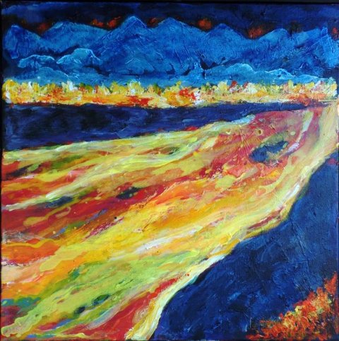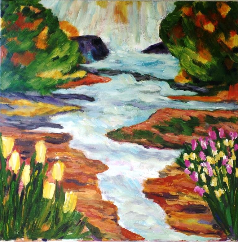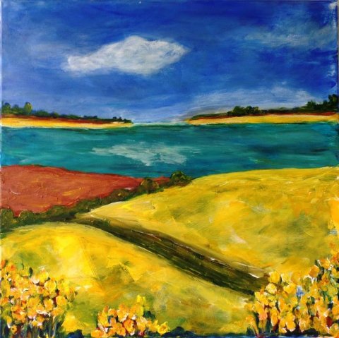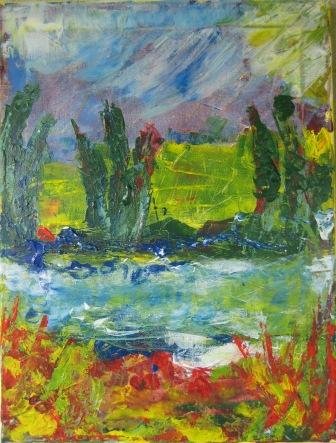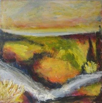 Floden. 30 x 40 cm. Solgt. |  Forårskrat. 60 x 80 cm. Solgt. |  Hav og kyst. 60 x 60 cm. Solgt. |