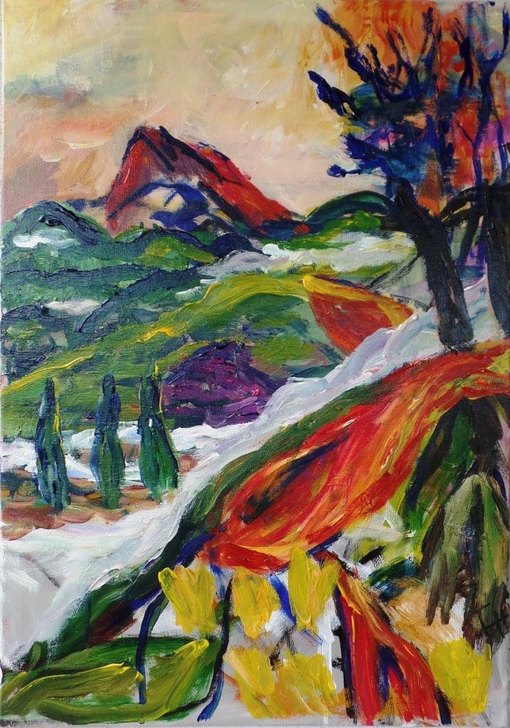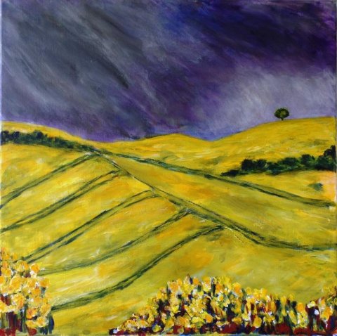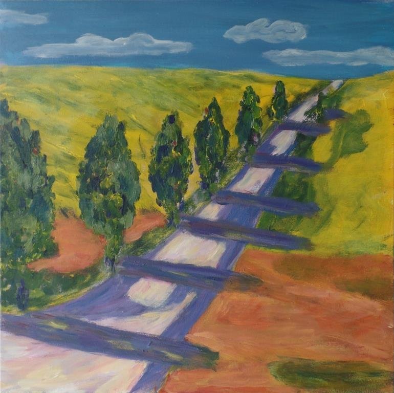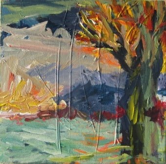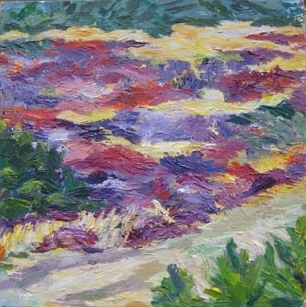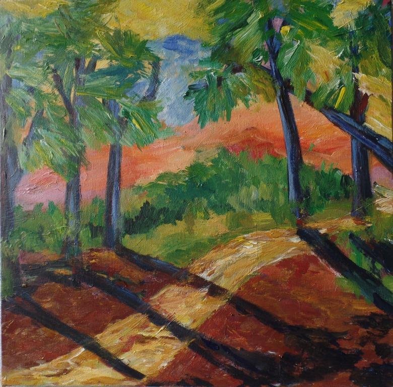 Udsigt til Jernhatten. 80 x 80 cm. |  Valmueland. 60 x 60 cm. Solgt. |  Vejtræ 1. 24 x 30 cm. Solgt. |