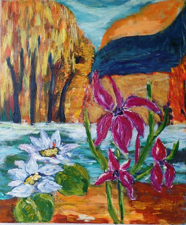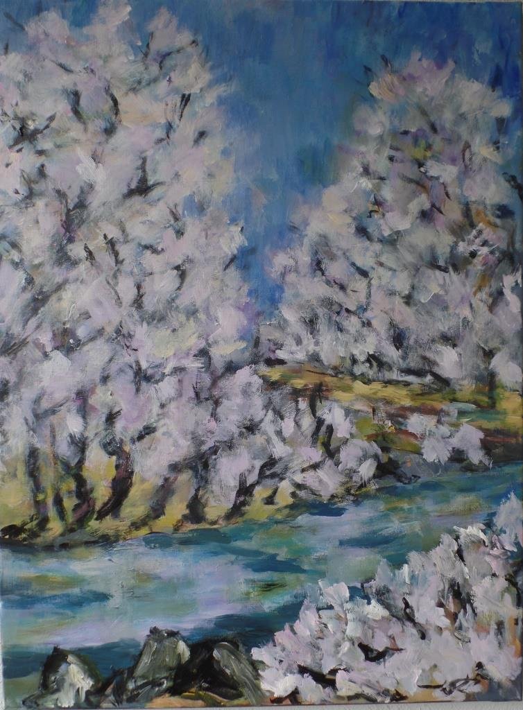 Forårskrat 5 - Slåen. 60 x 80 cm. |  Valmuer ved vand 2. 40 x 40 cm. Solgt. |  Valmuer ved vand. 80 x 80 cm. Solgt. |