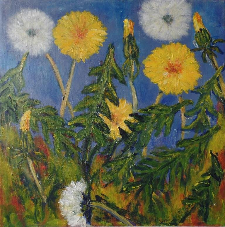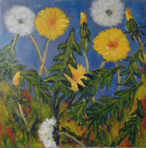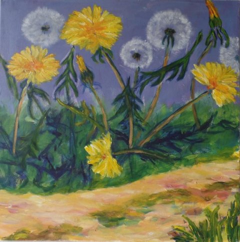 Mælkebøttevæld. 40 x 40 cm. |  Mælkebøtter ved vejen". 50 x 50 cm. |  Skygger ved vejen. 50 x 50 cm. |