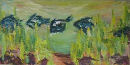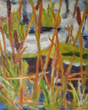 Bølgen. 60 x 60 cm. Doneret til Børnecancerfonden. |  Bølling siv. 40 x 50 cm. Solgt. |  Blomstringstid. 60 x 80 cm. Solgt. |