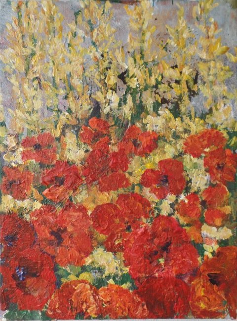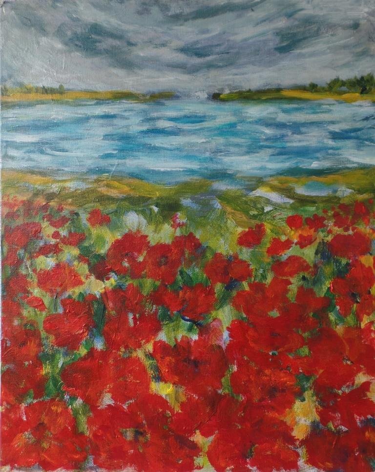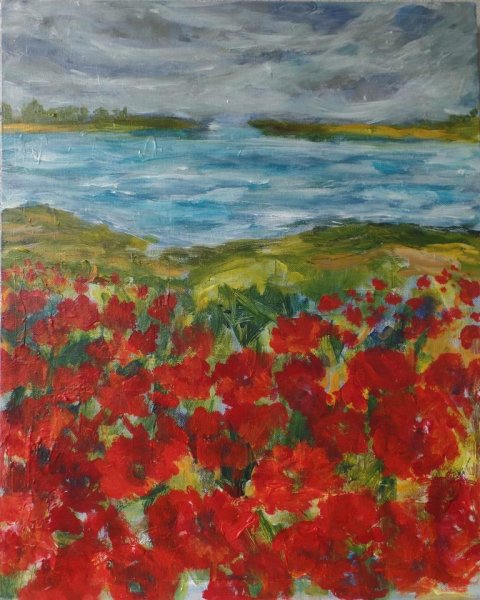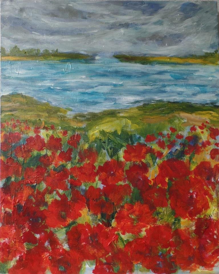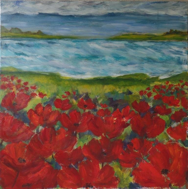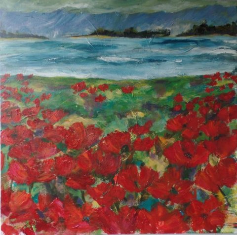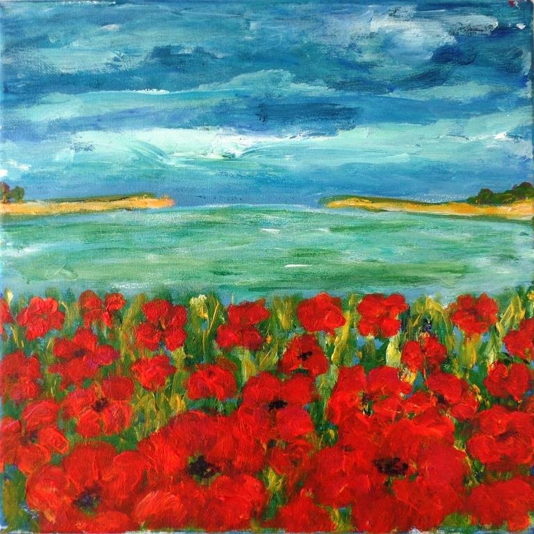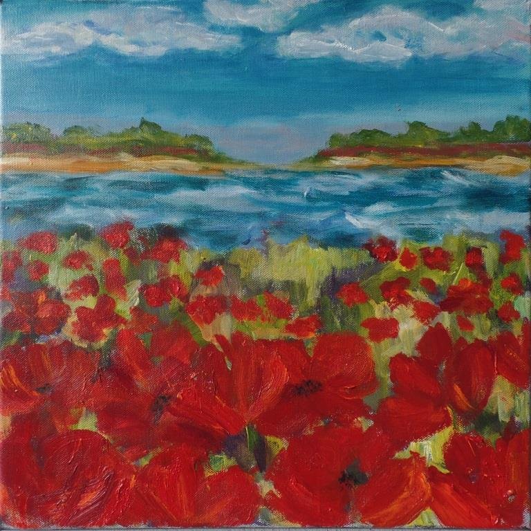 Valmuer ved vand 3. 40 x 40 cm. Solgt. |  Valmuemark ved vigen. 80 x 80 cm. |  Kornblomster og valmuer. 80 x 80 cm. Solgt. |