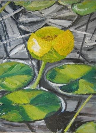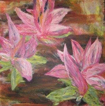 |  Nøkkerose på spring. 60 x 60 cm. Doneret til Børnecancerfonden. |  Nøkkerose 1. 30 x 30 cm. Solgt. |