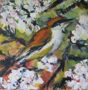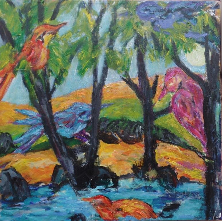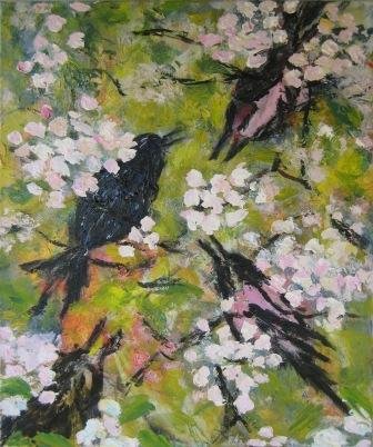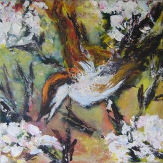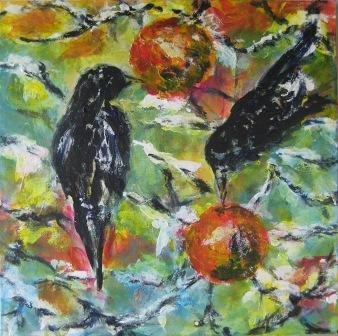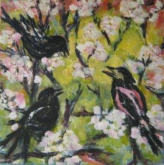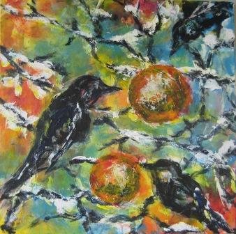 Sneen smelter igen. 30 x 30 cm. Solgt. |  Skovens fugle 2. 50 x 50 cm. |  Skovens fugle. 50 x 50 cm. |
