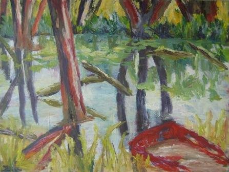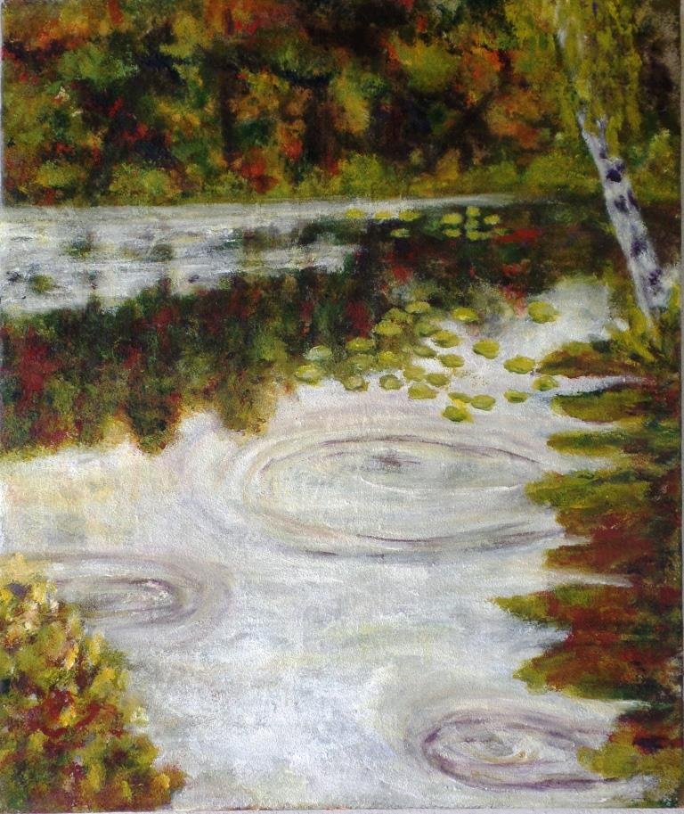 Flere ringe i vandet. 60 x 80 cm. Solgt. |  Å med båd. 80 x 60 cm. Solgt. |  Å med båd 2. 80 x 60 cm. Solgt. |