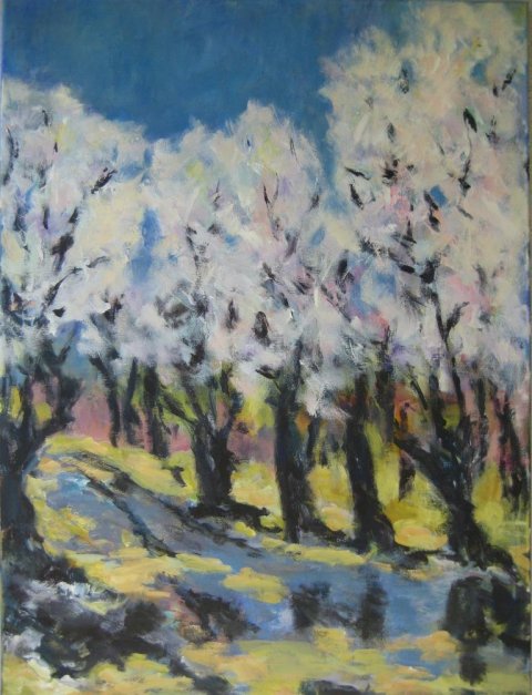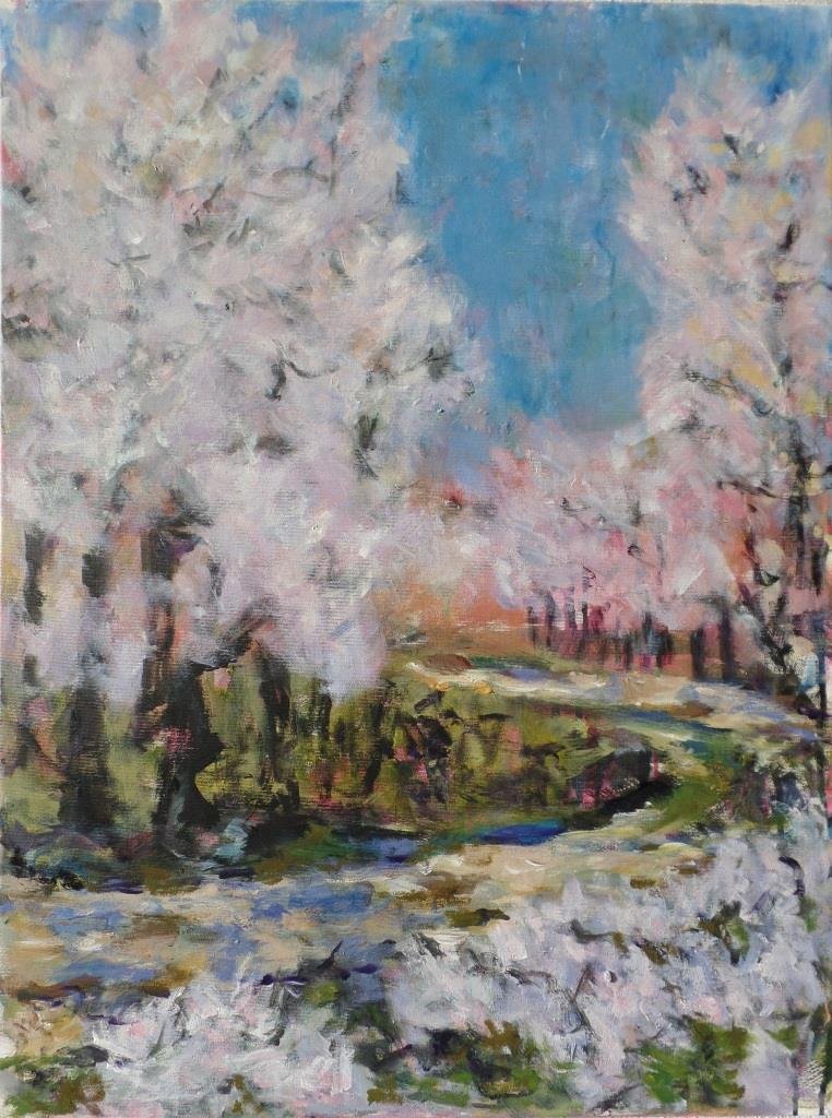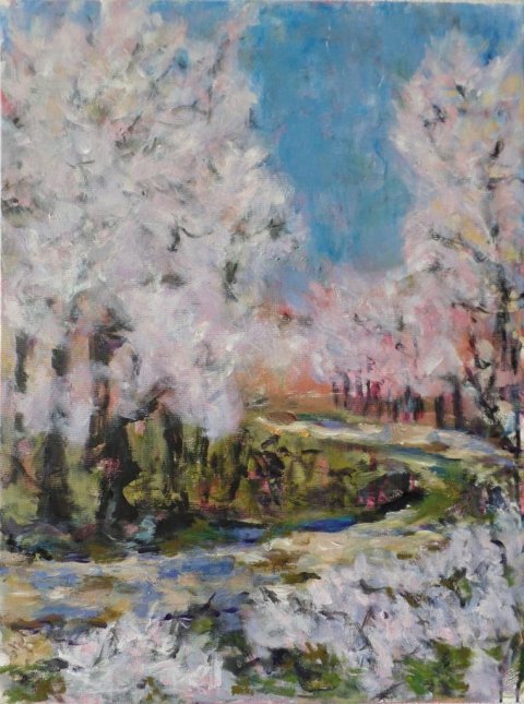 |  Frost i marts. 30 x 30 cm. Solgt. |  Slåenhegn - Forår. 60 x 80 cm. Solgt. |