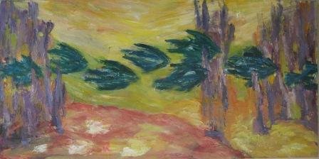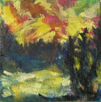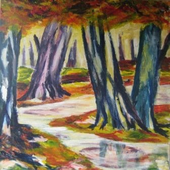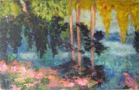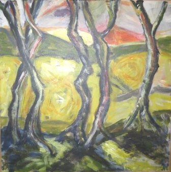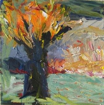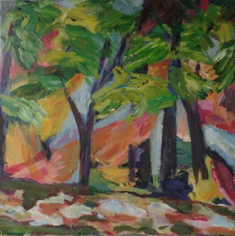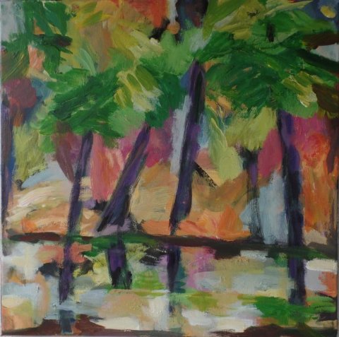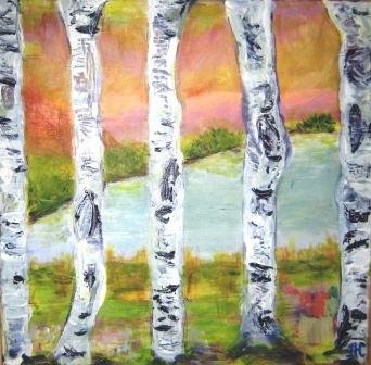 Aftenstammer. 40 x 40 cm. Doneret til Kirkens Korshær Galleri, Hornslet. |  Birk. 40 x 40 cm. Doneret til Kirkens Korshær Galleri, Hornslet. |  Blå anemoner. 30 x 30 cm. Solgt. |