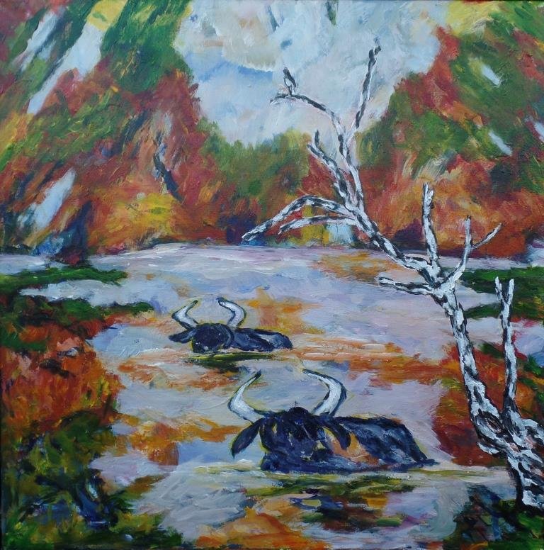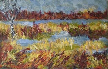 Efterårskrat 3. 60 x 80 cm. |  |  Pause ved vandet. 50 x 50 cm. Solgt. |