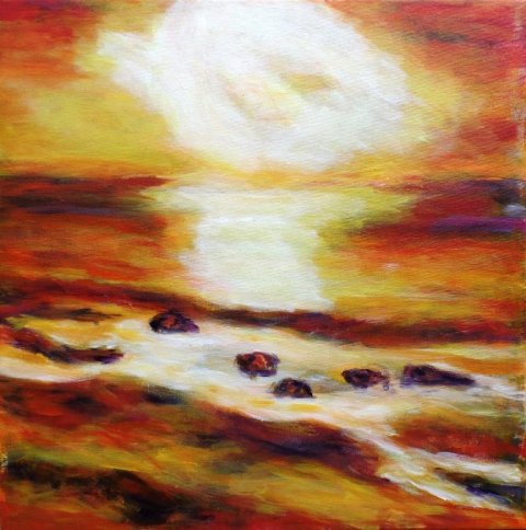Solnedgang på Mols. 30 x 40 cm. Solgt. |  Solens corona. 50 x 50 cm. |  Å med båd 2. 80 x 60 cm. Solgt. |
