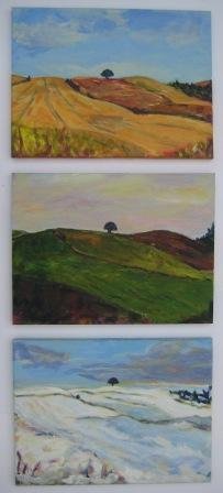 Træet på toppen - vinter. 30 x 30 cm. Solgt. |  Træet på toppen - efterår. 30 x 30 cm. Solgt. |  Tre på stribe. 80 x 60 cm. Solgt. |