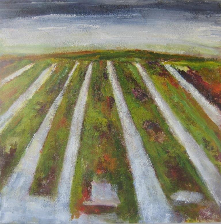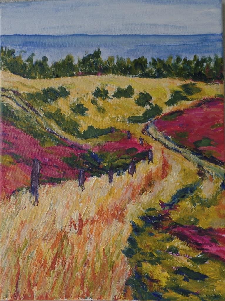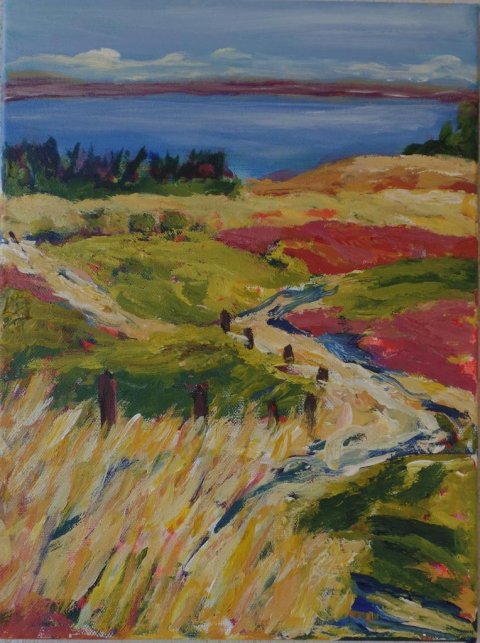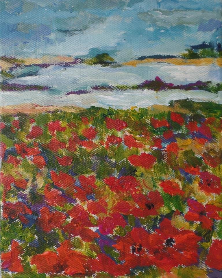 Valmuemark ved vandet 1. 40 x 40 cm. |  Valmuer ved Knebel Vig. 24 x 30 cm. Solgt. |  Molsstier. 30 x 40 cm, akryl på lærred. |