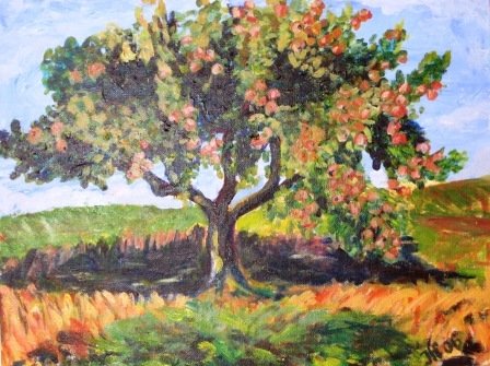 Belle de Boskop i blomst. 50 x 50 cm. |  Da solen brød frem. 50 x 50 cm. |  På toppen - efter høst. 80 x 40 cm. Solgt. |