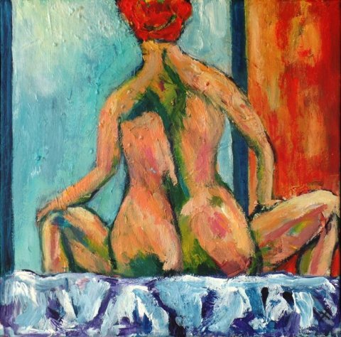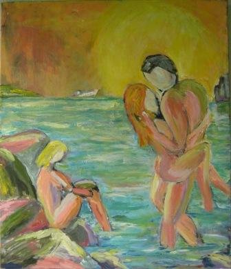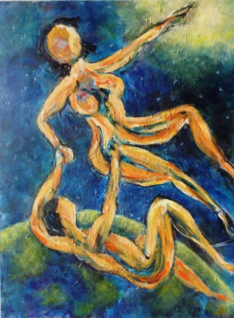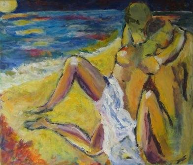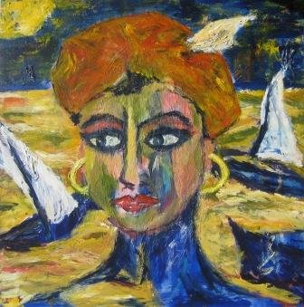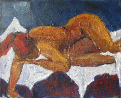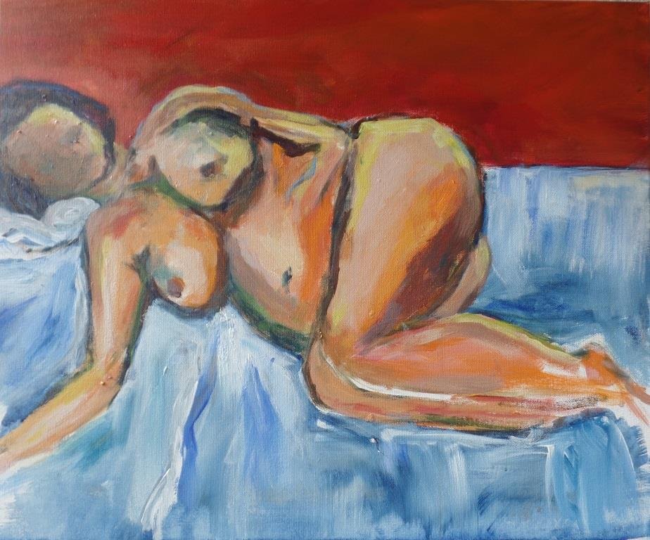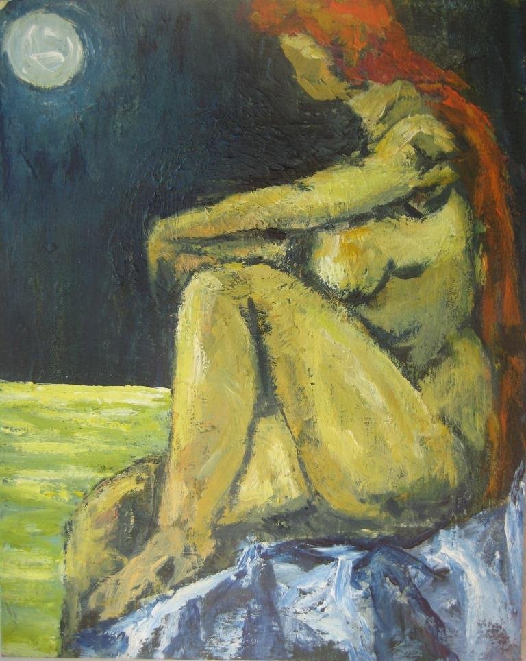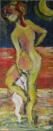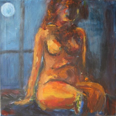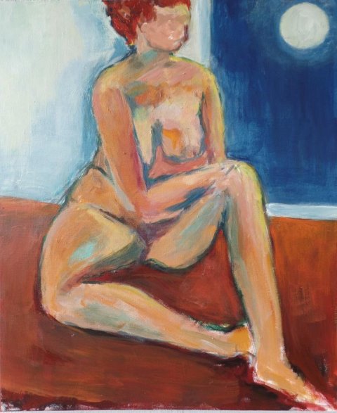Kvinde på rød. 40 x 50 cm. Doneret til og ophængt på European Art [...]Museum i Vinderup ved Frederiksværk.Læs mere...↑ |  |  Blå måne. 60 x 60 cm. Solgt. |
