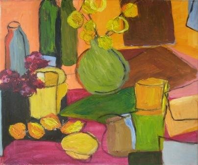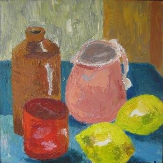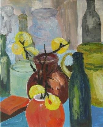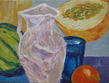 Cykel blå. 30 x 40 cm. Privat eje. |  Stilleben 1. 50 x 40 cm. Solgt. |  Spildt mælk/Appelsin og kande. 40 x 30 cm. |