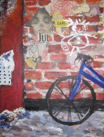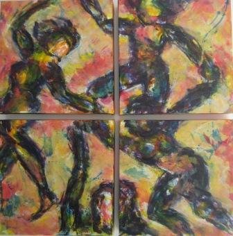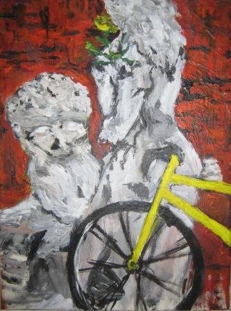 Dans - fire dele samlet til ét motiv. 40 x 40 cm. |  Cykel rød. 50 x 40 cm. Solgt. |  Cykel gul. 30 x 40 cm. Privat eje. |