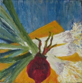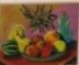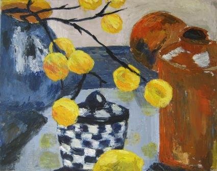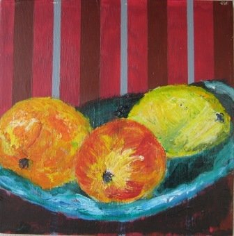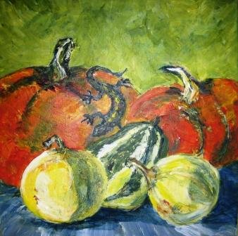 Kvæder og kokosnød. 50 x 40 cm. |  Kvæder i opstilling. 60 x 50 cm. |  Firben på besøg. 50 x 50 cm. Solgt. |