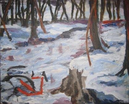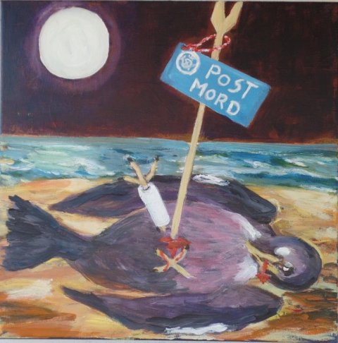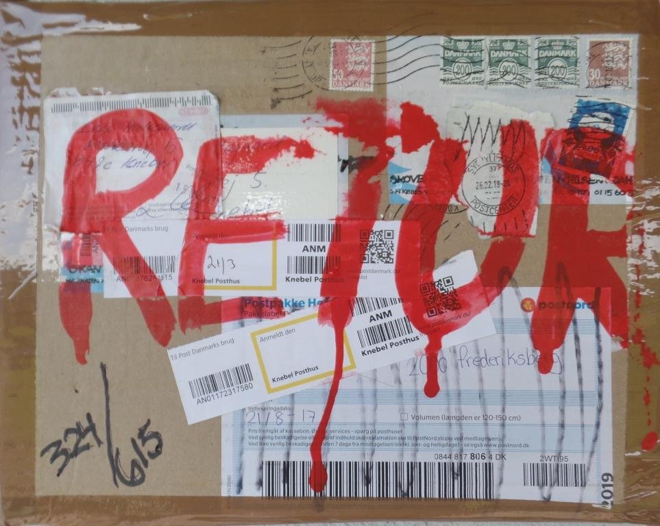 |  Return to sender. 30 x 24 cm. Værket blev antaget til den censurerede Mississippi-udstilling 2018. |  En smøg i kulden. 60 x 80 cm. |