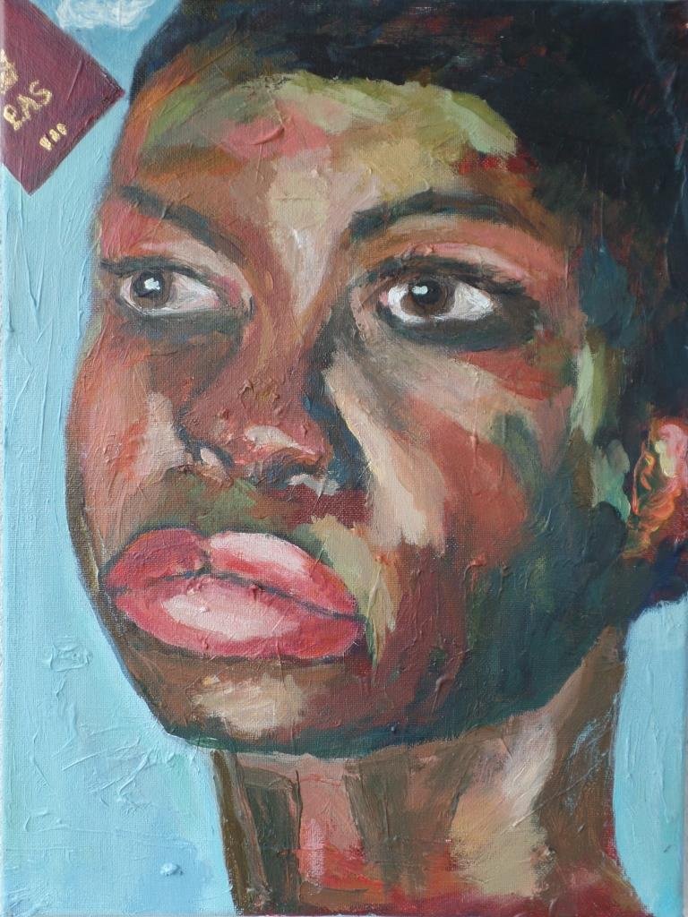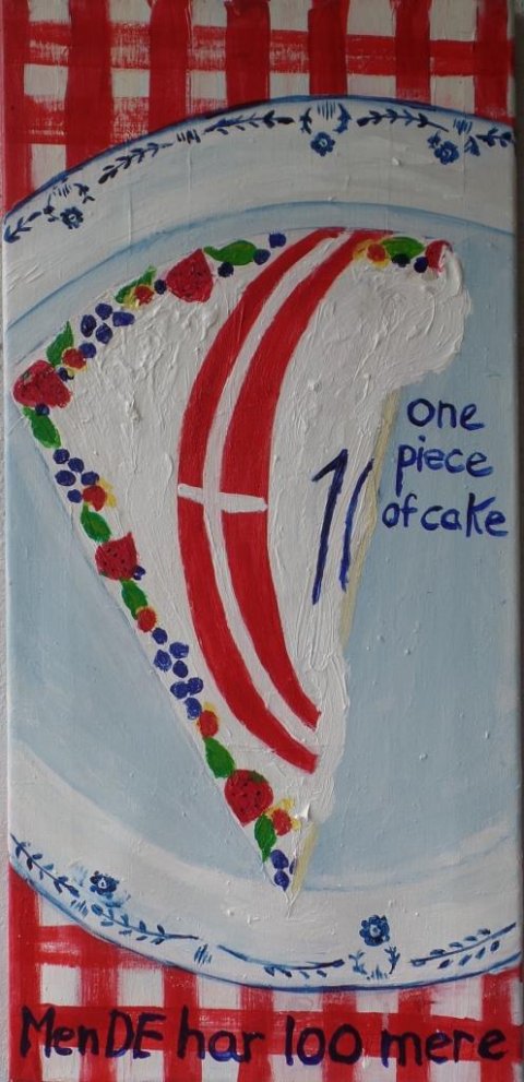 Dansk kage med sydfrugter. 40 x 40 cm. Værket blev antaget til den censurerede Bjerringbro [...]Udstilling i 2017. Værket blev også antaget til den censurerede Mississippi-udstilling 2018.Læs mere...↑ |  Ser langt efter dansk pas. 30 x 40 cm. Værket blev antaget til den censurerede Mississippi-udstilling 2018. |  |