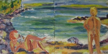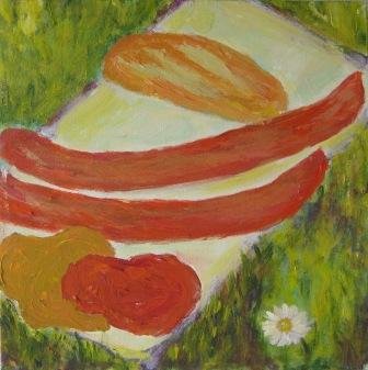 Susanne i badet. 30 x 72 cm. Solgt. |  Stilleben - To pølser med brød. 30 x 30 cm. |  Stilleben - Grønt. 30 x 30 cm. |