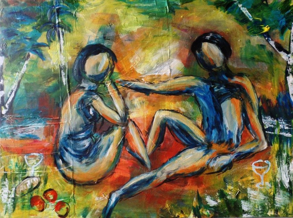 Frokost i det grønne. Parafrase efter Manet, 70 x 60 cm. |  Friheden flyver. Parafrase efter Erik Clausen, 60 x 70 cm. |  |