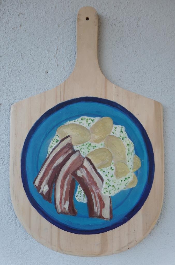 Stegt flæsk og persillesovs. 28 x 45 cm. Akryl på bræt. |  Kvinde på højkant. 40 x 80 cm. |  Alt på ét bræt. Akryl på bræt. 38 x 12,5 cm. |
