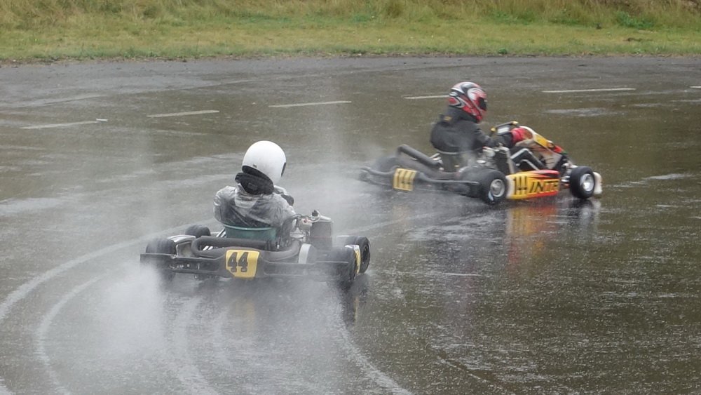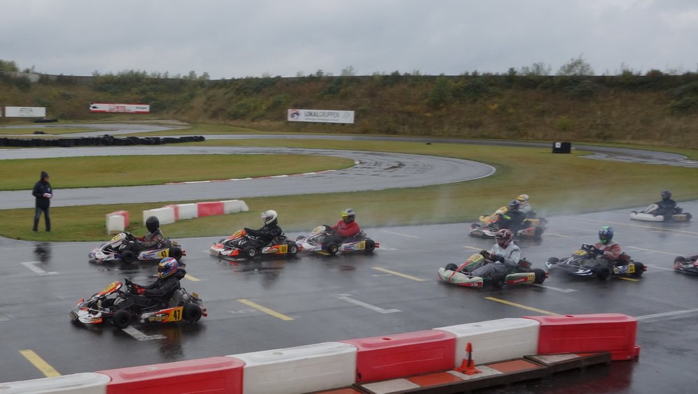 Gruppe 1 bestod af Cadett Junior og Rotax Max Mini. Kun Rotax Minier må køre med regndæk - men det gav ikke nogle problemer for meget hurtigt delte de sig op og havde deres races.