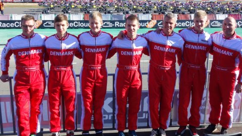Vi og andre havde IKKE køredragter med, men til gengæld vore teamtrøjer. Men pludselig fandt en eller anden ud af at de skulle stille op i køredragterne. Det kunne ikke lade sig gøre efter hurtig udregning, men massesuggessionen virkede, og man kørte til hotellet for at hente køredragterne. Man nåede også tilbage - men ikke til fotograferingen hverken på stregen eller på tribunen. Til gengæld fik Allan præmien for at sætte hurtigste tid fra kartbanen til hotellet og retur. Stort tillykke til Allan (Mads' far).