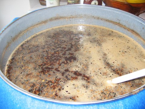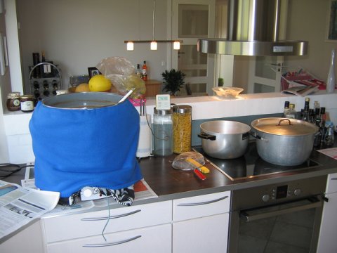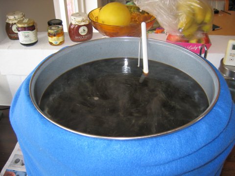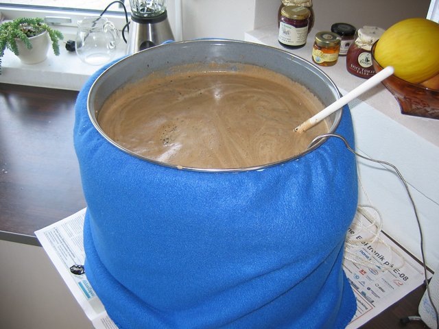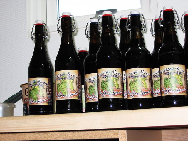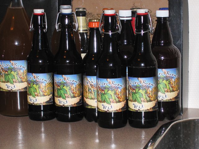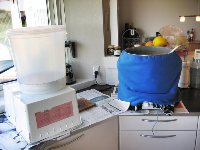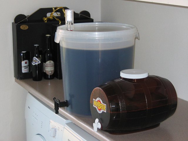 Emaljeret 30 L Weck elgryde med 2 kw varmelegeme. Isoleret med 2 polyestertæpper foldet til ialt 8 lag og bundet omkring gryden med reb.  Mæsken til min julebryg med bl.a. hvede chokolade malt.  Lauter tun med taphane og stål indsatssi med 3mm huller.  Brygsetup med gryder klar med varmt spargevand.  Den mørke urt under opvarmning.  26 liter julebryg og et lille testbryg med ingefær er sat til gæring.  Det endelige resultat af min wit.  ...og min Coffee Stout er på flaske.