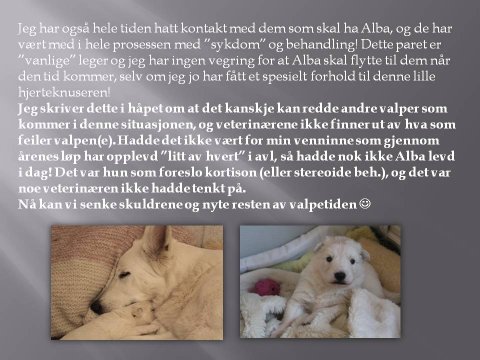 I dag har vi vært en tur hos veterinæren igjen :) Denne gangen har Alba fått utslett på magen som sansynligvis har gitt henne litt jurbetennelse..... Dette kommer visst av at hun er mye ute å leker i reinet og ikke klarer å slikke seg tørr slik som de voksne hundene, og er mye fuktig. Nå får hun ikke være ute så mye, og vi smører Fucidin på morra og kveld og håper at det forsvinner av seg selv. Hun må ha på seg "pysjamas" så hun ikke vasker seg på eksemet, så går det fortere bort. Tirsdag skal vi på kontroll.