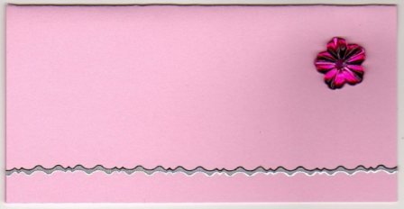 Lyserød bordkort 5x10 cm med pink blomst og med sølv kant.