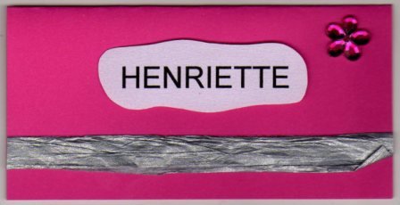 Pink bordkort 5x10 cm. med sølv bånd og pink blomst.