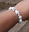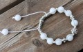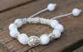 Shamballa-inspireret armbånd med 10 mm hvide kvarts-sten, swarovski-rundeller og sølvfarvet simili-kugle.