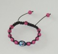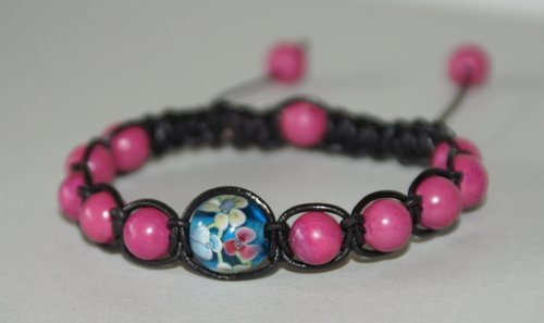 Shamballa-inspireret armbånd med pinkfarvede "turkiser". I midten en 12 mm lampwork glaskugle med blomstermotiv. Håndknyttet med sort lædersnøre.