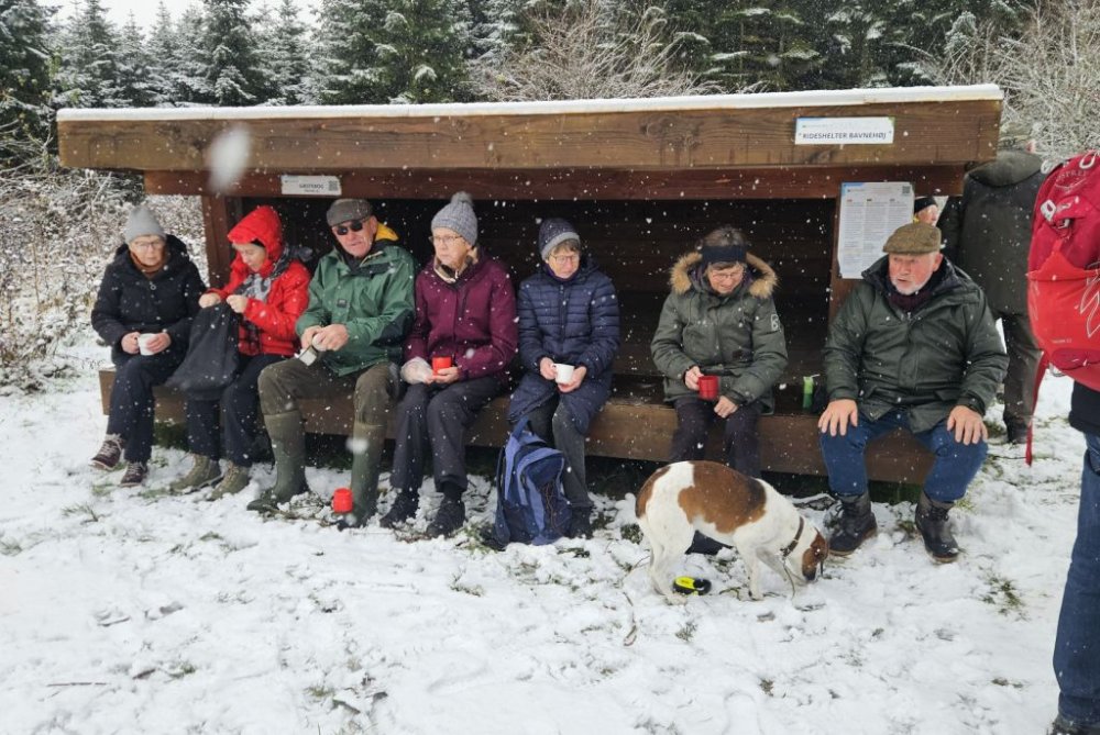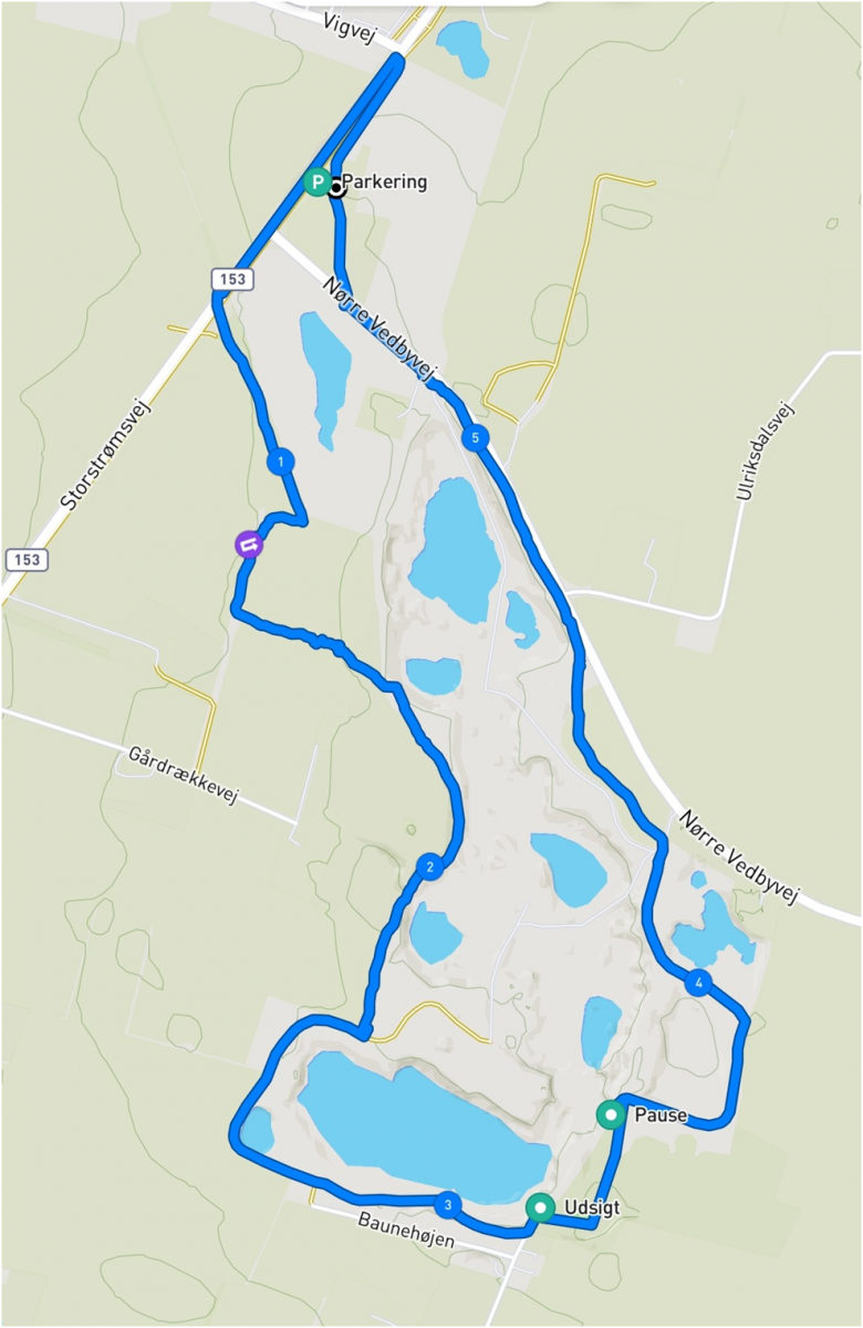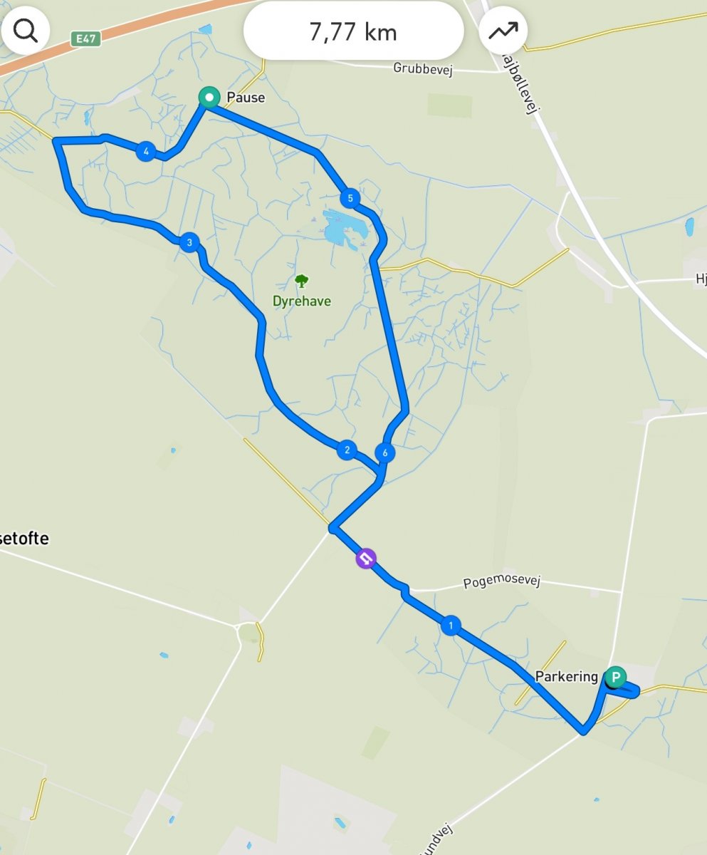 Vi holder pause ved trec-banen (for heste) og turen er på knap 6 km. Så der bliver tid til 20 min. pause.