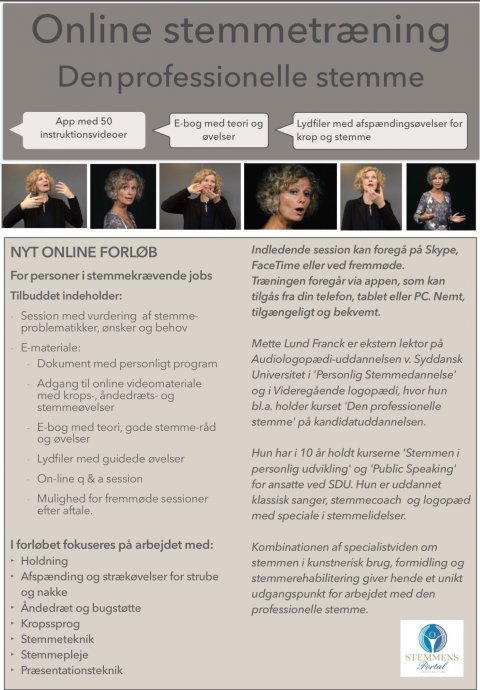 Appen indeholder 60 instruktionsvideoer med krops-, åndedræts- og stemmeøvelser. Disse øvelser vil komme mine studerende i Personlig Stemmedannelse på SDU samt de sang- og stemme-elever og klienter, jeg har i min private praksis, til gode. Appen indgår ligeledes i de online-forløb, jeg kommer til at tilbyde.