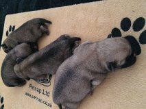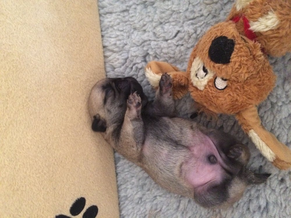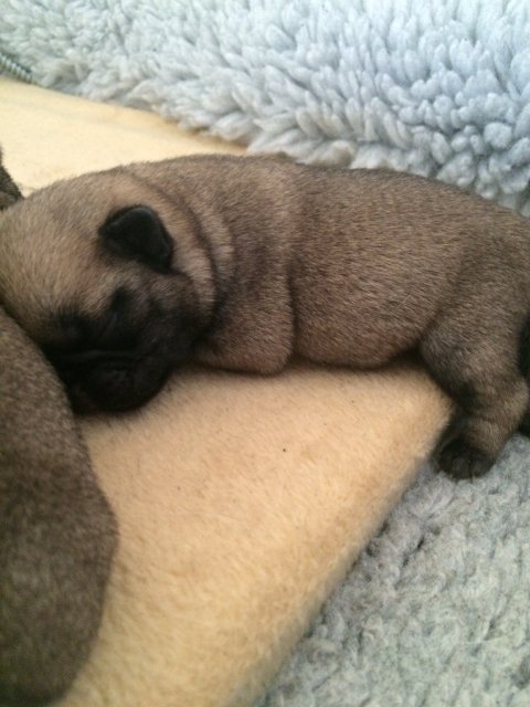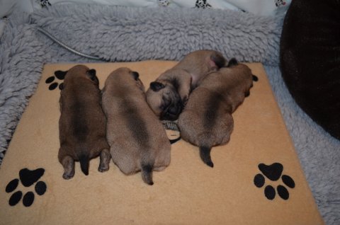 4 små mops hvalpe, som ikke laver andet end sove og spise