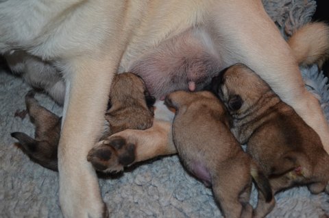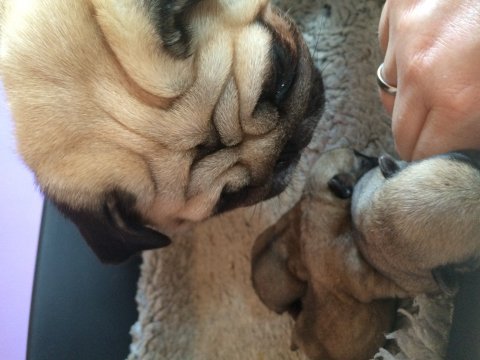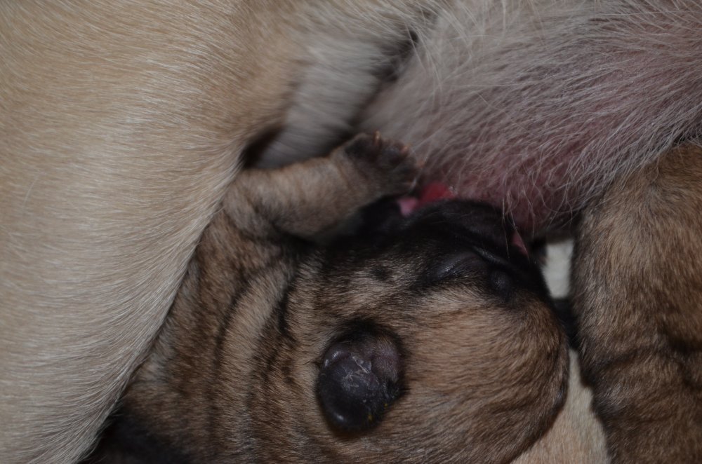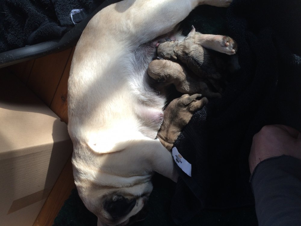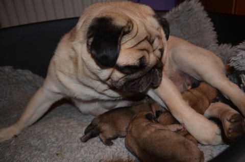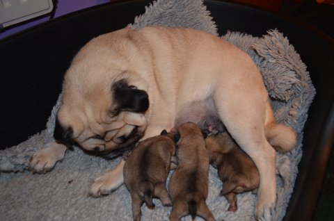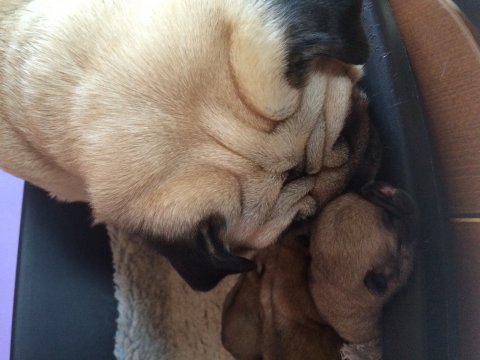 3 små mops er født. Det er første gang Mooni bliver mor, og hun klarer det så flot. Både fødslen og at passe mops hvalpene.