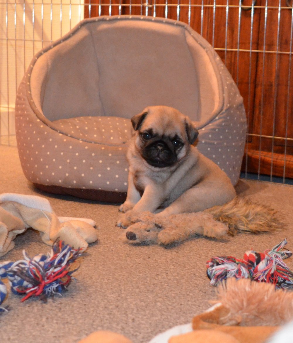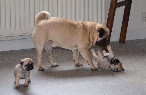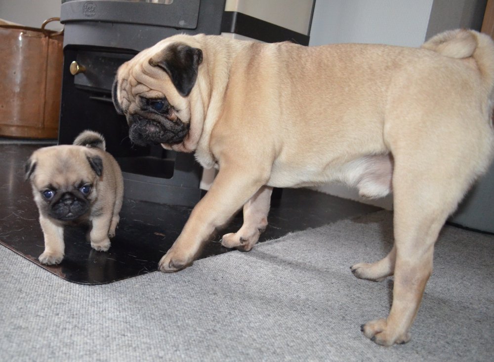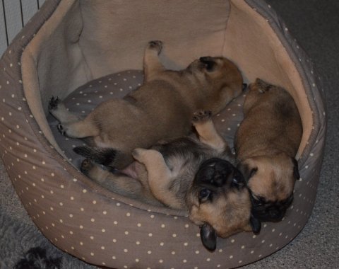 De leger med især Zuma som også er en stor hvalp på 11 mnd. Zuma ELSKER de små hvalpe. Den ene dag var han gået op i deres lille kurv, havde trykket sig helt baglæns så de små kunne være der foran ham - og så sad han bare og kiggede på dem. DET er kærlighed