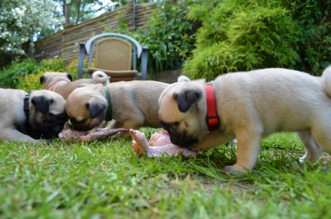 Nu får hvalpene BARF 3 gange om dagen. De får stadig mælk hos deres mor, men BARFEN er et klart hit hos dem