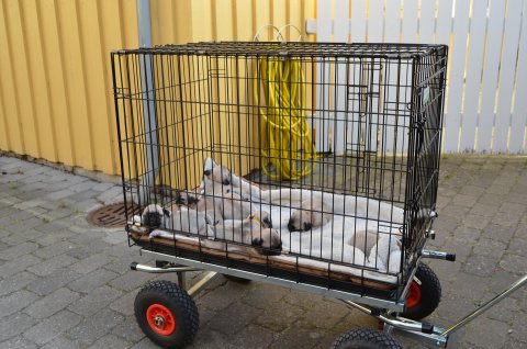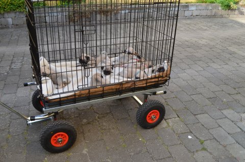 Vi har også været på socialiseringstur i bur, hvor hvalpene har set/hørt tog - motorcykler - cykel - løbehjul og MASSER af voksne og børn som stoppede os hele tiden og ville snakke med de skønne hvalpe